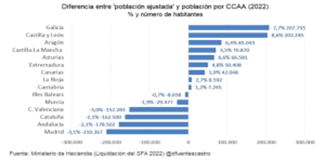 Un dels punts clau de la reforma és la nova definició de “població ajustada”, que hauria de servir per clarificar les necessitats reals de finançament de cada comunitat, tenint en compte la despesa en serveis públics. La situació actual, com mostra la taula següent, és profundament desequilibrada: