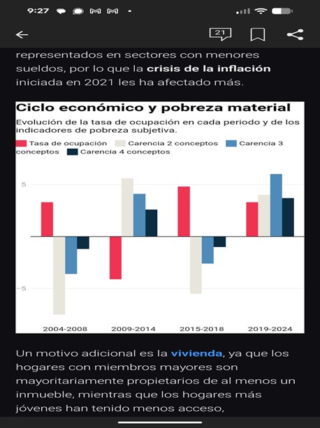 Un gráfico publicado por El Confidencial con el título “Ciclo económico y pobreza material” sintetiza esta realidad con datos contundentes. Se muestran indicadores de pobreza o privación material subjetiva medidos según cuántos elementos básicos no puede permitirse una persona o un hogar. Estos datos forman parte de las estadísticas oficiales de la Encuesta de Condiciones de Vida (ECV) del Instituto Nacional de Estadística (INE) y se utilizan también en informes sobre pobreza y exclusión social.