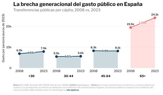 El resultat dona lloc a un desequilibri gran en la distribució de la despesa pública per edats, com es veu en el seu creixement, moderat (1,15%) pels menors de 15 anys, molt més alt (1,24%) pels més grans de 65, i estancat pel que fa a les altres generacions pel període 2008-2023.