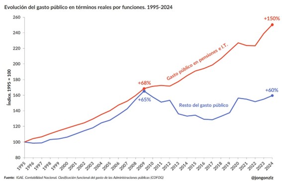 La taula següent mostra com la variació en la despesa pública total ha anat en direcció contrària a les necessitats: En els últims vint anys, 2004-2024 s’ha reduït en transports (ferrocarrils per exemple) educació (malgrat la crisi de l’ensenyament), habitatge (no és per res que ha esclatat), i ordre públic. Però ha crescut de forma abassegadora en pensions que s’enduen pràcticament tot creixement de despesa del període.