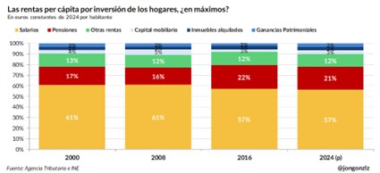 El gràfic adjunt és ben explícit i assenyala l’evolució de l’estructura de rendes a Espanya de l’any 2000 al 2024, calculat en euros comptants. Com es pot observar, creix notablement el pes de les pensions ni més ni menys que quatre punts i en termes percentuals ni més ni menys que un 23% en relació amb la base de l’any 2000.
